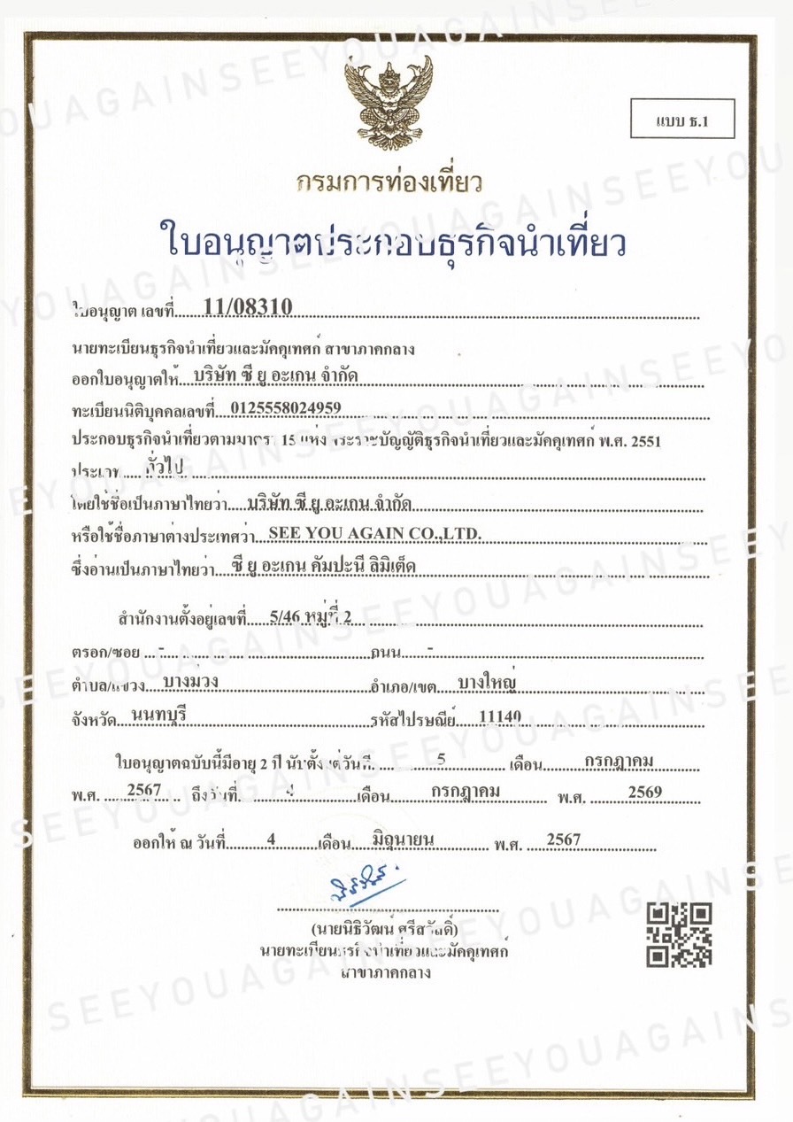 บริษัท ซียูอะเกน จำกัด (สำนักงานใหญ่) 5/46 หมู่ที่ 2 ตำบลบางม่วง อำเภอบางใหญ่ จังหวัดนนทบุรี 11140 ใบอนุญาตประกอบธุรกิจท่องเที่ยว TAT License 11/08310 สมาชิกสมาคมไทยธุรกิจการท่องเที่ยวเลขที่ 03993 เลขประจำตัวผู้เสียภาษี 0 1 2 5 5 5 8 0 2 4 9 5 9 Mobi