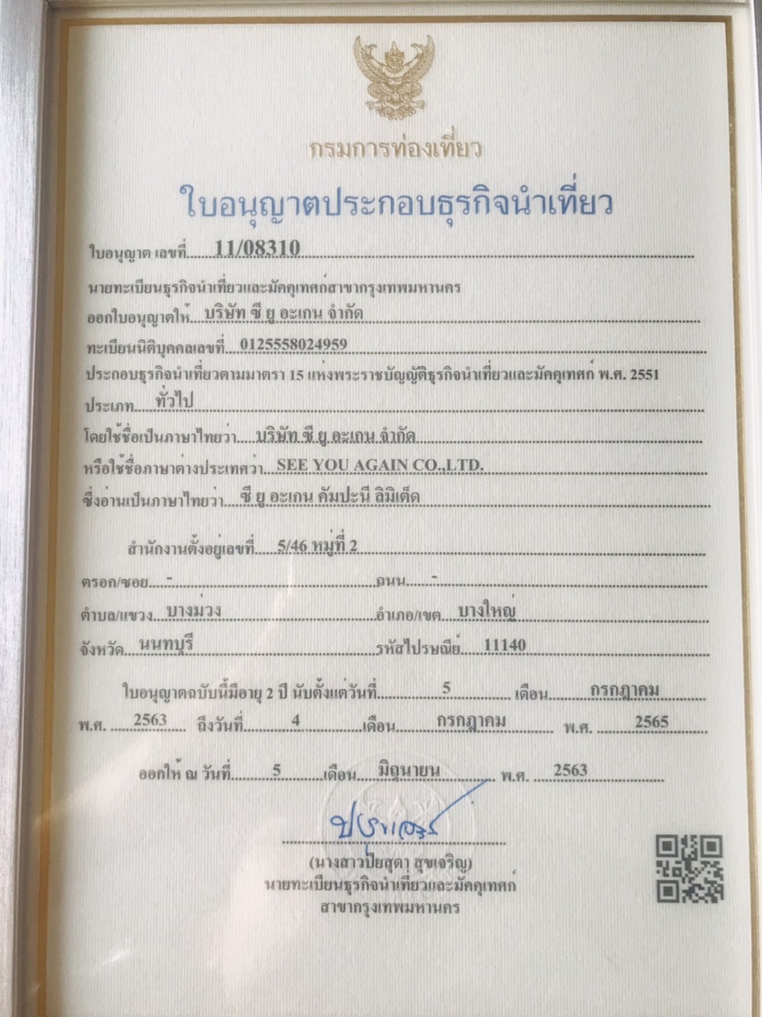 บริษัท ซียูอะเกน จำกัด ใบอนุญาตนำเที่ยว 11/08310 (LICENSE 11/08310) บริษัทนี้ได้จดทะเบียนการค้าเลขที่ 0125558024959
