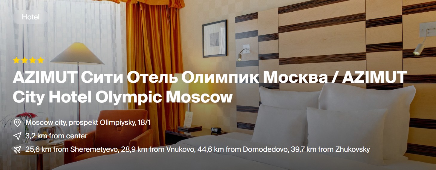 Address: 129110, Moscow, Olympiskyi pr 18/1 AZIMUT City Hotel Olympic Moscow