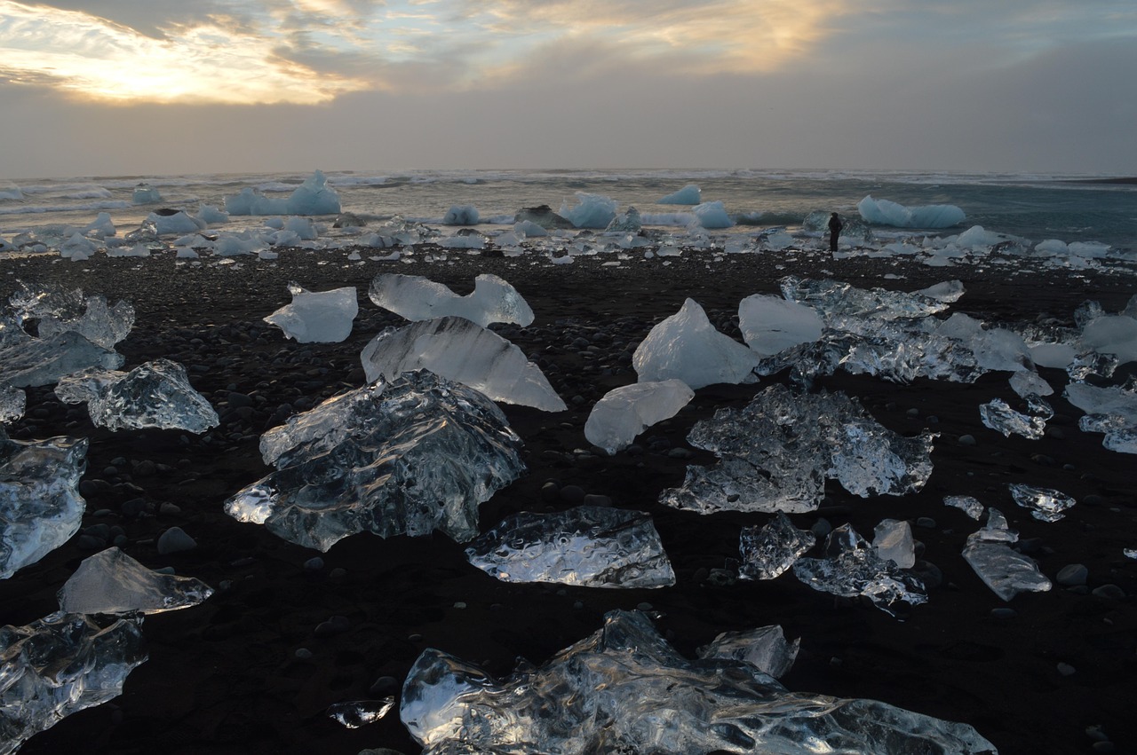 ไม่ไกลกันคือชายหาดสีดำที่ผู้คนเรียกว่า Diamond Beach ก้อนน้ำแข็งใสที่ถูกคลื่นซัดขึ้นมาเกยบนทรายสีดำระยิบระยับเมื่อกระทบแสงแดด ราวกับเพชรเม็ดใหญ่กระจายอยู่ทั่วชายฝั่ง