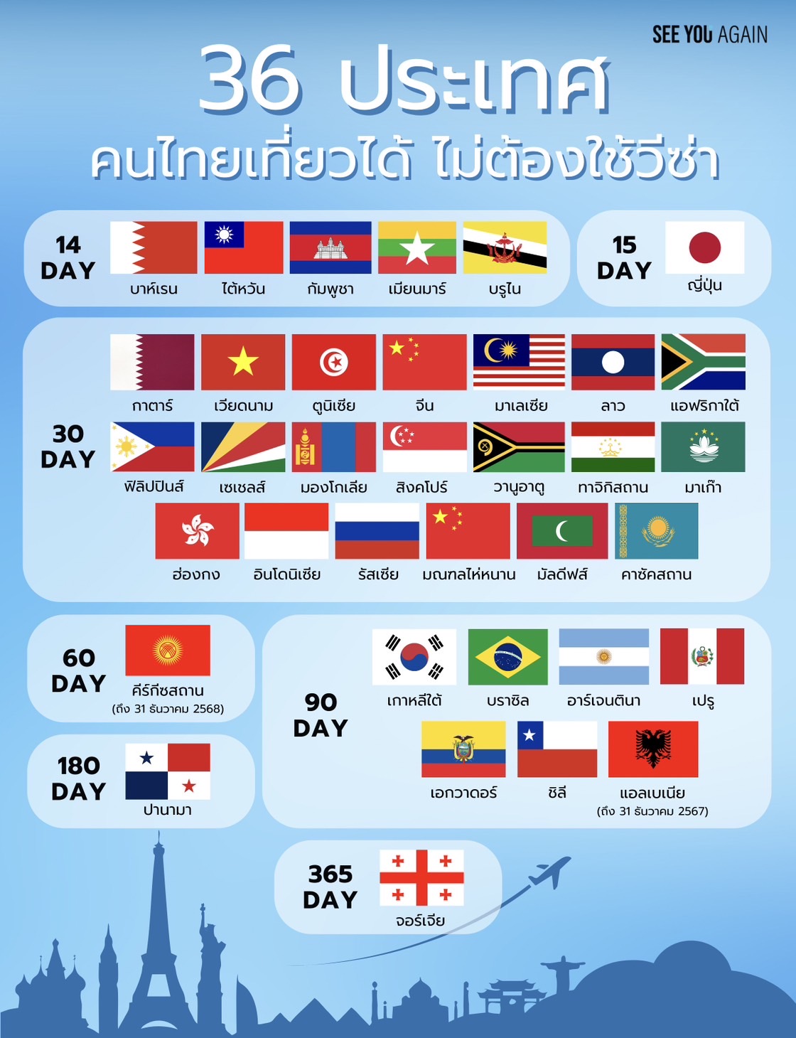 ข้อมูลอัพเดทปีพ.ศ. 2567 ลิสต์อัพเดท 36 ประเทศสำหรับนักท่องเที่ยวชาวไทย ที่ถือพาสปอร์ตไทย