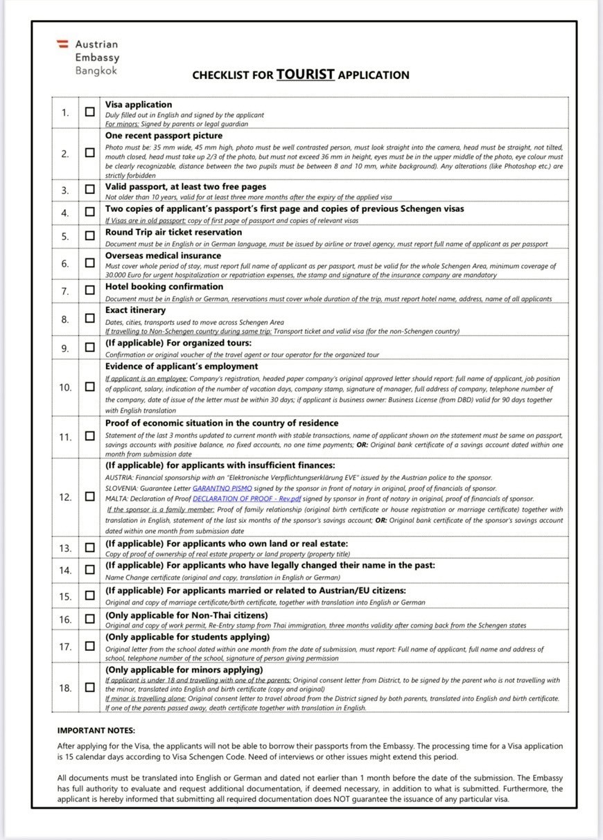 รายการตรวจสอบสำหรับการยื่นขอวีซ่าท่องเที่ยว เชงเก้น ประเทศออสเตรีย